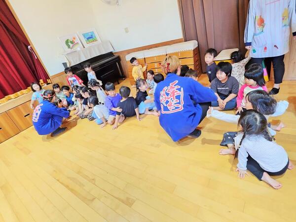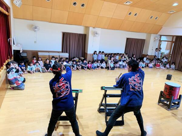 毎年、北九州市や若松区のお祭りや競技会に出る迫力の唄と演奏を、子どもたちは集中して見ていました。
