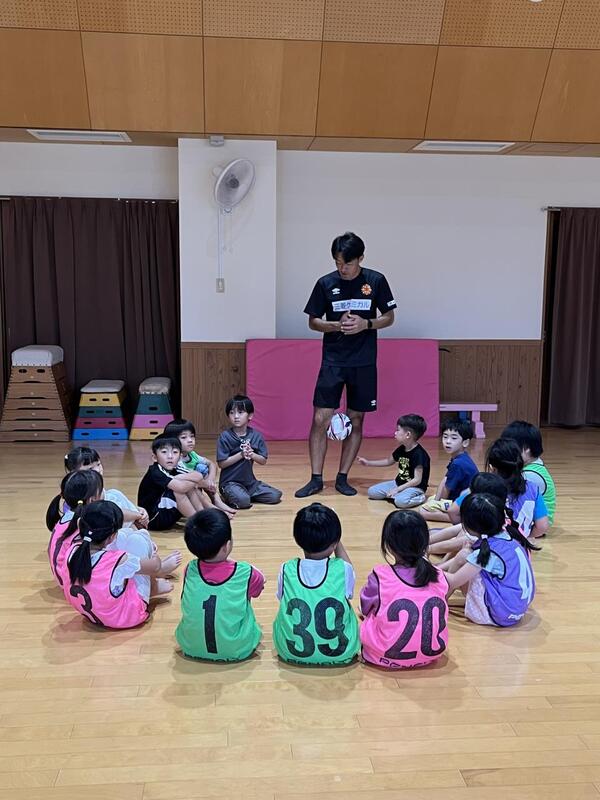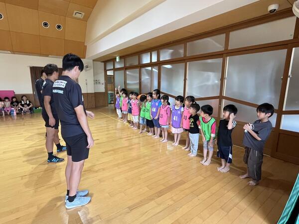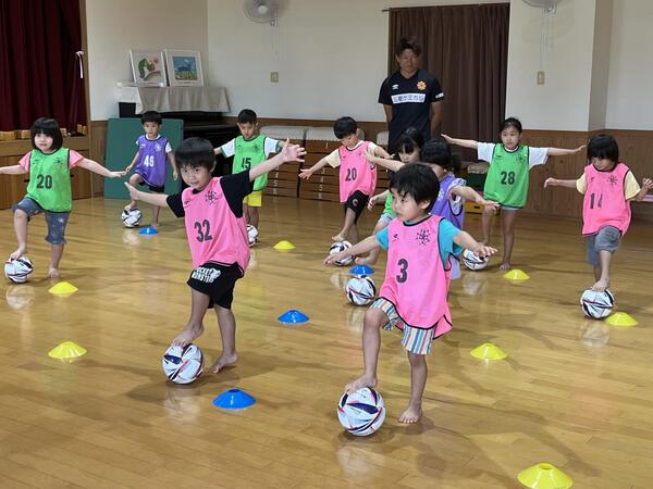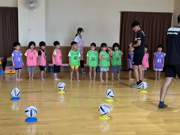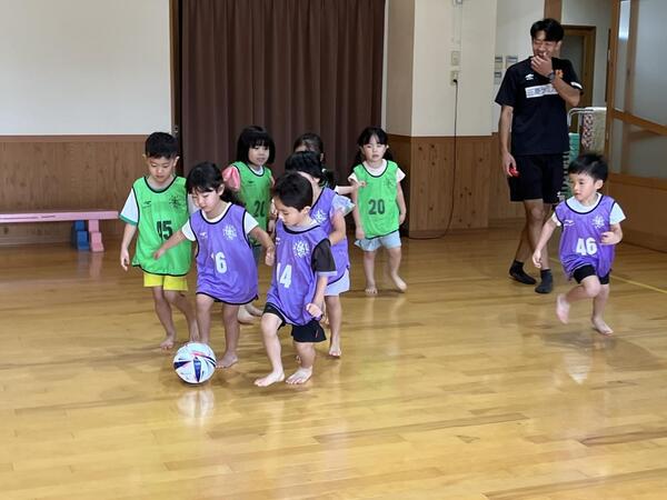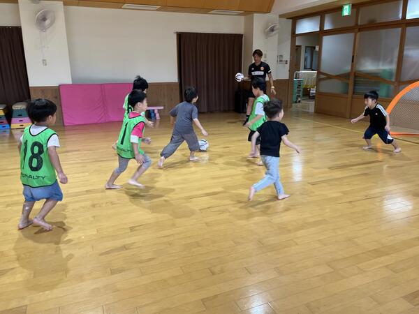 年中児(きりん組)と年長児(ぞう組)が体を動かしたり、ゲームをしたりして楽しくサッカーの体験をしました。