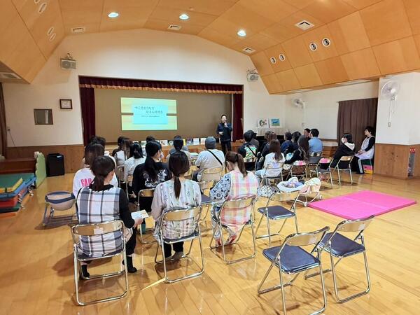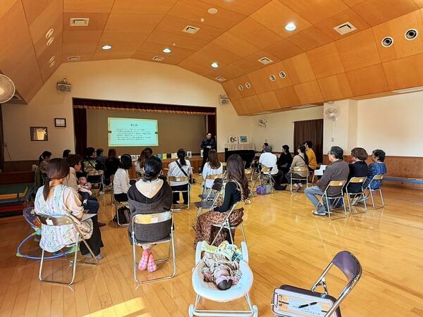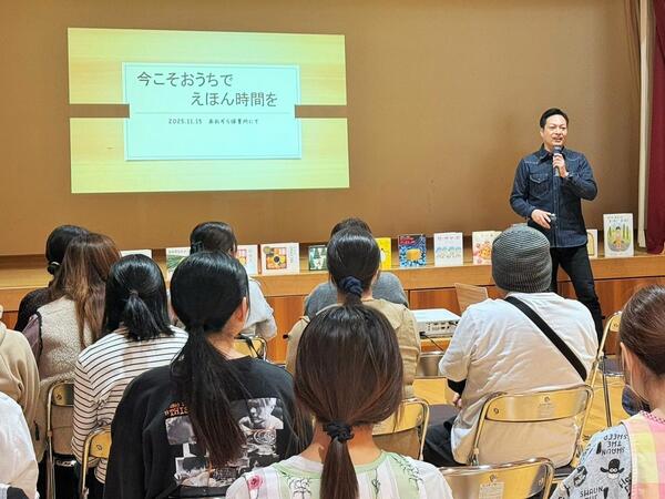 講師は「こどものとも福岡」社長の府後氏で、読み聞かせの大切さや子どもの成長発達との繋がりについて、絵本を紹介しながらお話をしていただきました。