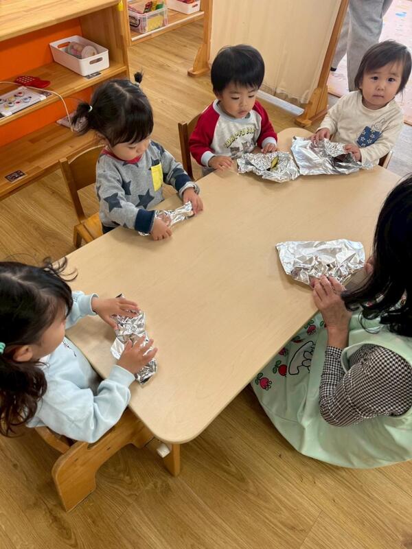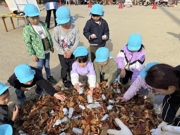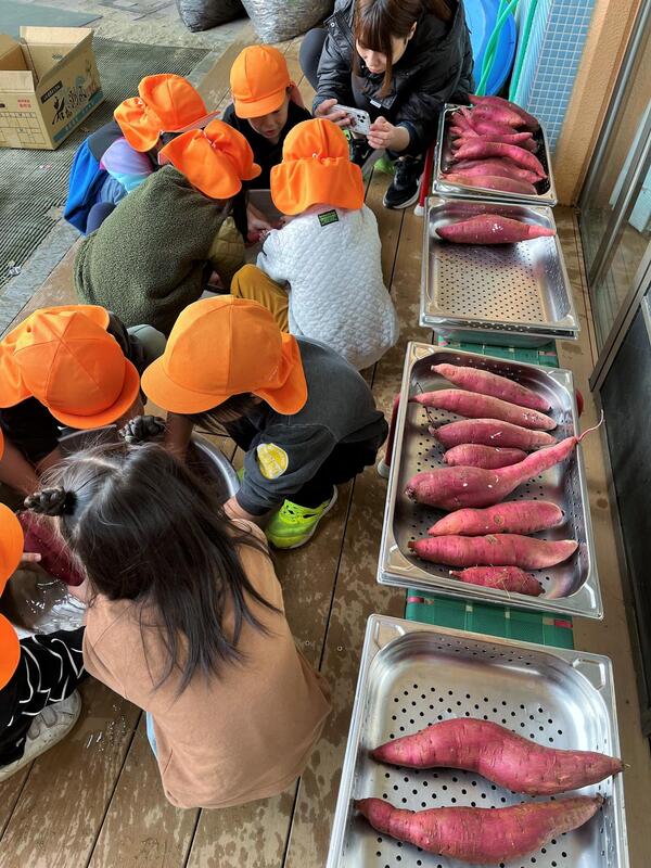 前日に、年長児が畑で収穫したさつまいもを洗い、朝みんなで準備をしました。