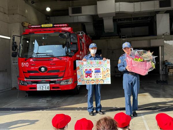 みんなで作ったメッセージとお花を消防署員の方に渡して、感謝の言葉を言いました。