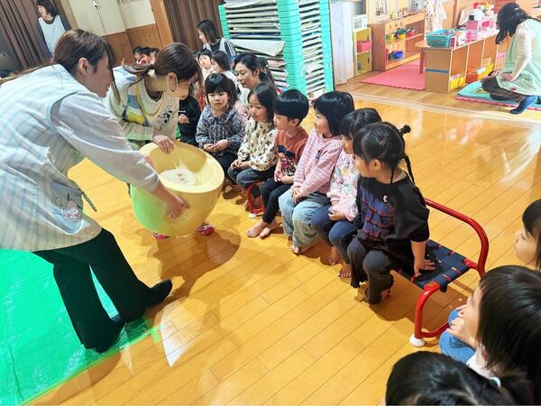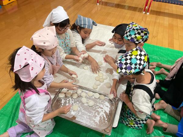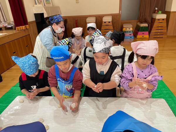 その後、年長児がもちを丸めて以上児3クラスは、(みたらし)(きなこ)でやわらかなおもちを食べました。